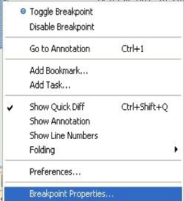 - Right-click the breakpoint and select Breakpoint Properties as shown in Figure 1.